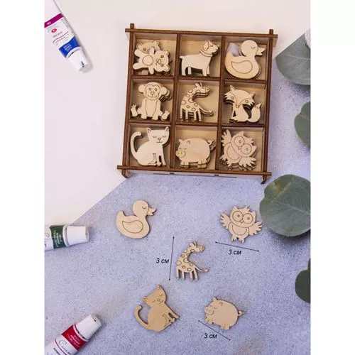 В наборе 9 дизайнов, по 4 украшения каждого вида. Средний размер 2,5х2,7 см. Деревянные фигурки упакованы в коробочку с ячейками, которую также можно использовать для воплощения творческих идей