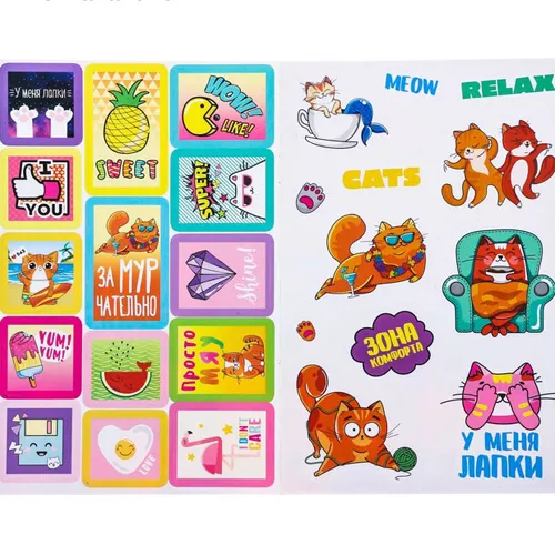 В наборе 8 бумажных листов 21х14 см с самыми различными наклейками, частично украшенных фольгированием
