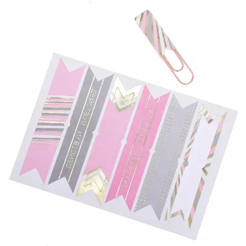 В наборе 6 скрепок и 6 флажков с фольгированием. Размер скрепки 4х0,8 см, размер флажка в сложенном виде 1х3,5 см