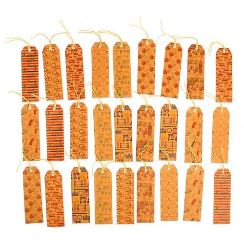 В наборе 27 тэгов из крафт бумаги высокой плотности с уже повязанными бумажными кручеными шнурами (каждого дизайна по 3 шт), размер каждого 4х12,7 см
