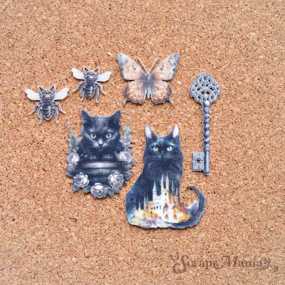 В наборе 24 украшения из ткани на фетровой основе. Высечки имеют фактуру ткани. Размер от 1,7х1,6 см до 6х5 см. Обратите внимание - "Шепот магии" входит в магическую серию дизайнов ScrapMania и великолепно дополняет коллекции "Заколдованные страницы" и "Затерянная среди роз"