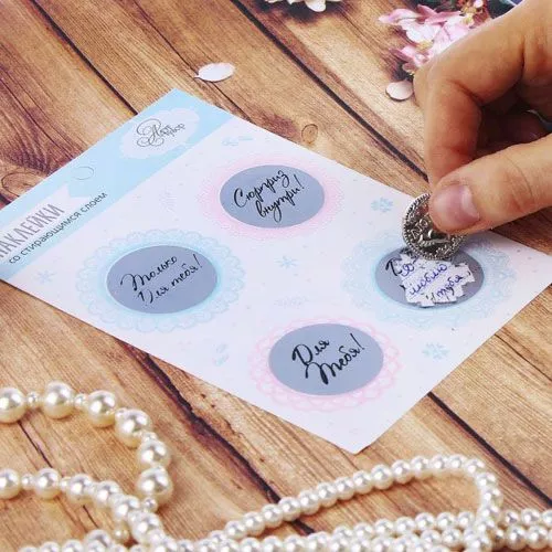 На листе расположены 4 наклейки и к ним 4 прозрачные плашки со стирающимся слоем (как в лотерейных билетах). Для создания тайной надписи напишите пожелание на наклейке, а сверху приклейте на прозрачный клей плашку со скретч-слоем, и вуаля! - сюрприз готов! Под скретч-слоем появляются ваши согревающие теплом слова
