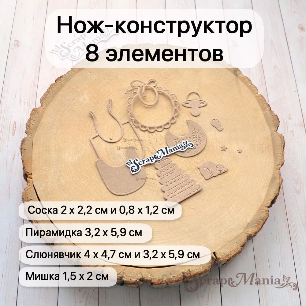 В наборе 8 ножей, соединенных перемычкой, которую при необходимости можно перекусить. Общий размер ножа 7,8х10,4 см. Размер соски 2х2,2 см и 0,8х1,2 см, пирамидки 3,2х5,9 см, слюнявчиков 4х4,7 см и 3,2х5,9 см, мишки 1,5х2 см, звездочек 0,5х0,5 см и 0,6х0,6 см. Идеальное дополнение к детским работам. Чудесный нож-конструктор позволит Вам проявить невероятную фантазию в своих работах. Компонуйте, меняйте, переставляйте местами вырубку и создавайте свой невероятный дизайн. Отлично сочетается с другими ножами из серии "Детство" (арт. 255645, 255652 и др)