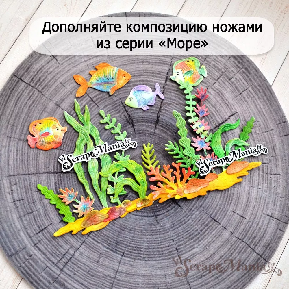 В наборе 15 ножей, соединенных перемычкой, которую при необходимости можно перекусить. Общий размер ножа 9,5х10,1 см. Размеры: водоросли 0,8х3,6 см, 1,5х3,6 см, 2,6х3,4 см, 2,4х7,1 см и 1,5х3 см, камни 0,4х0,8 см, 0,6х1 см, 1х1,7 см и 1,1х1,9 см, песок 1х4,3 см и 2,6х3,4, рыбки 1,7х2,6 см и 2х2,7 см. Нож-конструктор прекрасно подойдет для создания декора к самым разным страничкам, летним, морским работам, а также идеально впишутся в работу про воспоминания об отпуске на море. У набора арт. 255694 Нож "Море. Подводное царство" повторяются ножи в зеркальном варианте. Отлично сочетается с другими ножами "Море", "Пляж" и с нашими коллекциями бумаги "Море, я скучала", "Мой капитан", "Океания" и "Морячок"