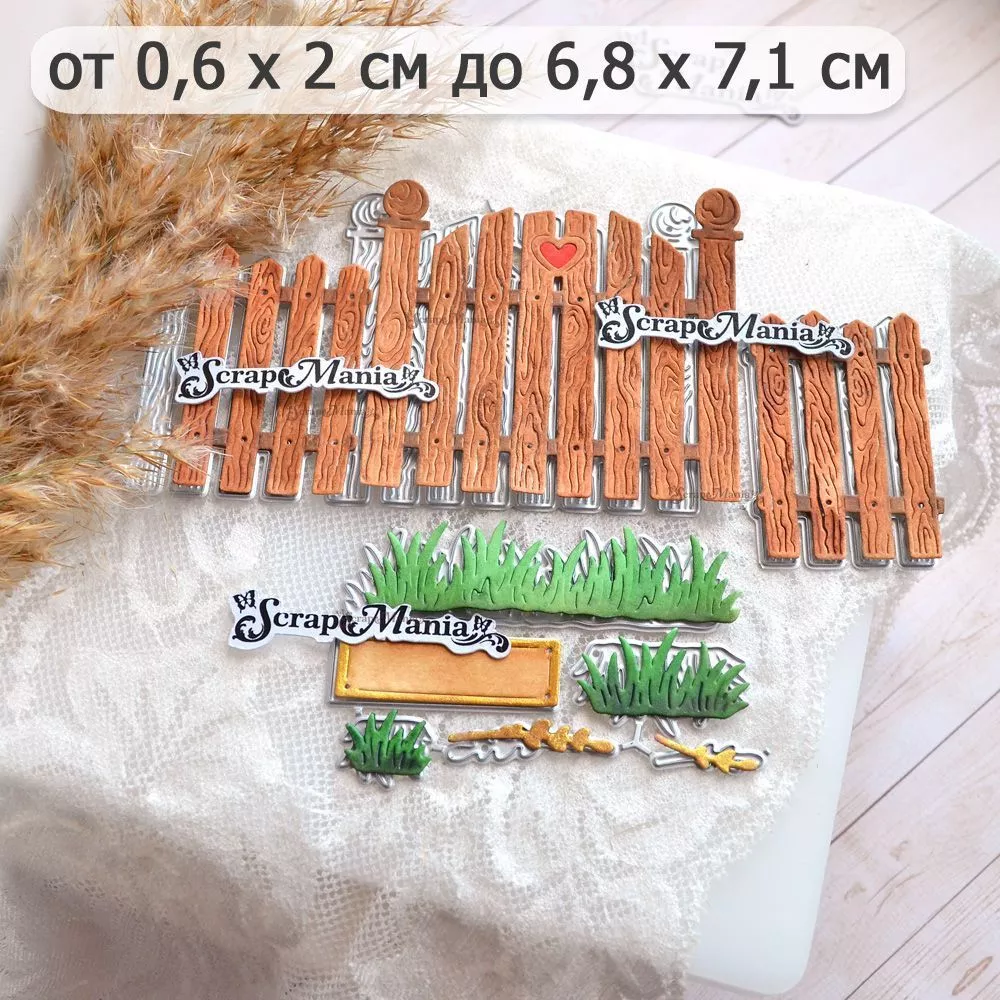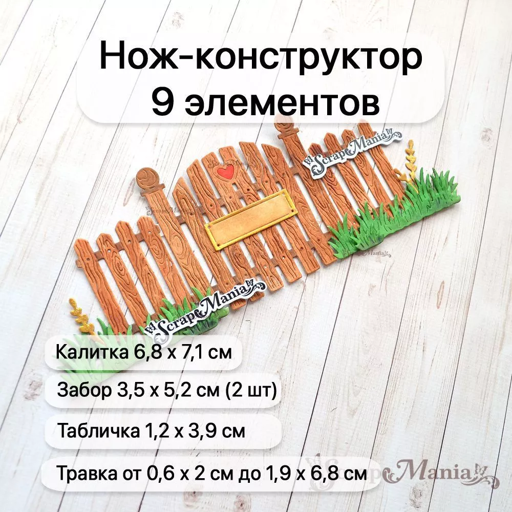 В наборе 9 ножей, соединенных перемычкой, которую при необходимости можно перекусить. Общий размер 11х11,7 см. Размеры: калитка 6,8х7,1 см, забор 3,5х5,2 см (2 шт), табличка 1,2х3,9 см, травка 1,6х1,3 см, 2,8х3,2 см и 1,9х6,8 см, веточки 0,6х2 см и 0,8х3 см. Идеальное дополнение к цветочным и деревенским работам. Чудесный нож-конструктор позволит Вам проявить невероятную фантазию в своих работах. Компонуйте, меняйте, переставляйте местами вырубку и создавайте свой невероятный дизайн. Дополняйте композицию ножами из серии "Усадьба" (арт. 255274, 255275, 255277, 255267). А так же сочетайте с ножами из серии "Палисадник", Цветочный магазин" и "Цветочный комплимент"