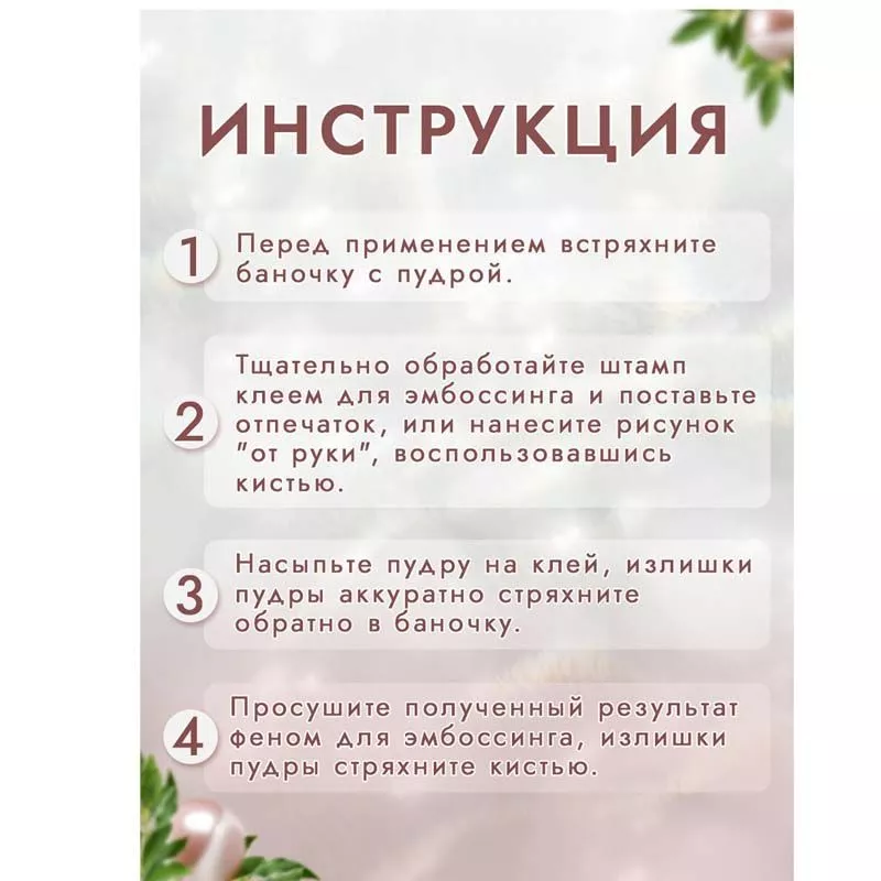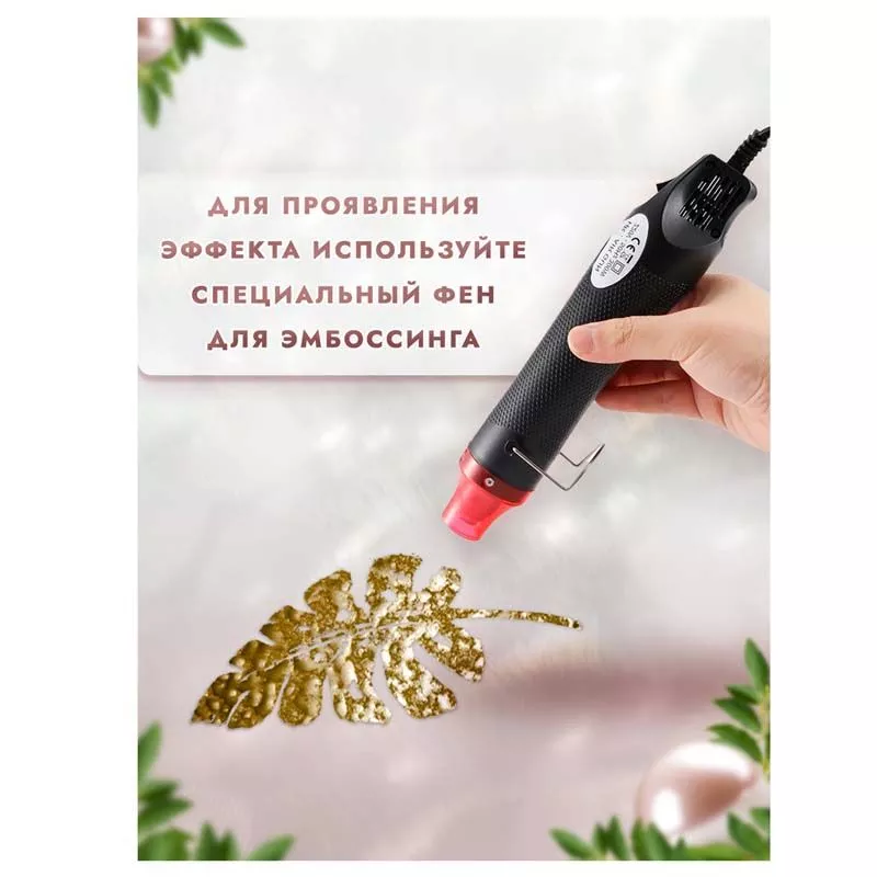 При запекании пудра создает непрозрачное объемное покрытие с эффектом металлического литья. Способ применения: нанесите клей для эмбоссинга на штамп или нарисуйте кистью на поверхности задуманный рисунок, затем нанесите пудру для эмбоссинга, пудра останется только там, где был нанесен клей, излишки пудры стряхните обратно в баночку. После этого, нагрейте полученный оттиск феном для горячего эмбоссинга, пока пудра полностью не расплавится