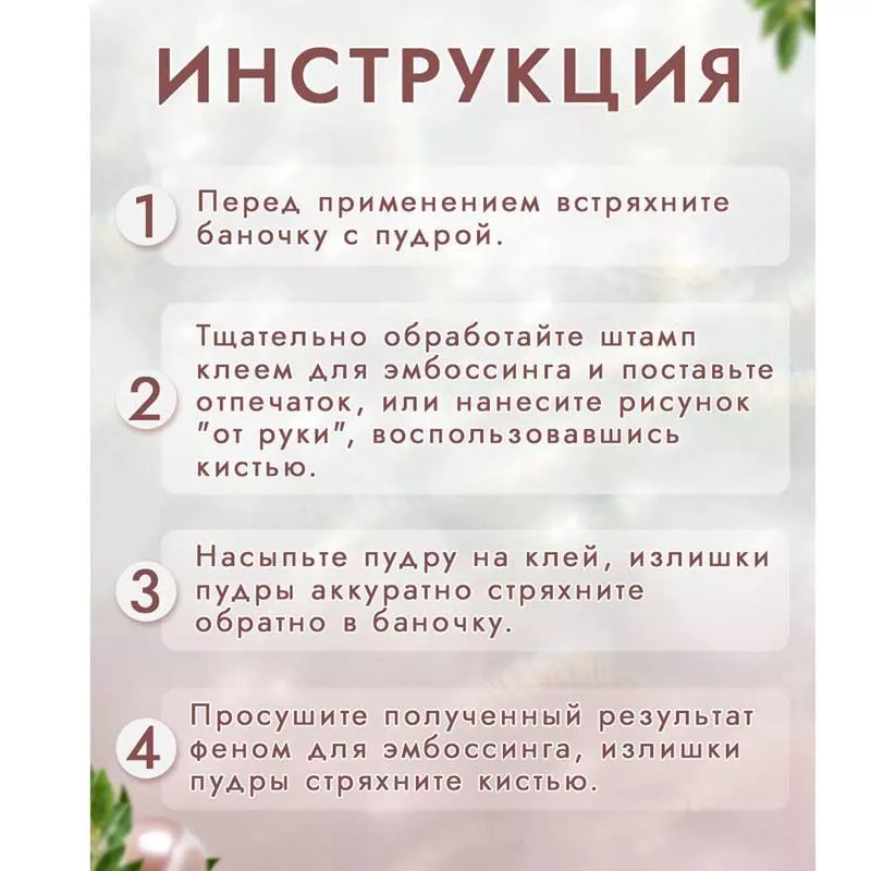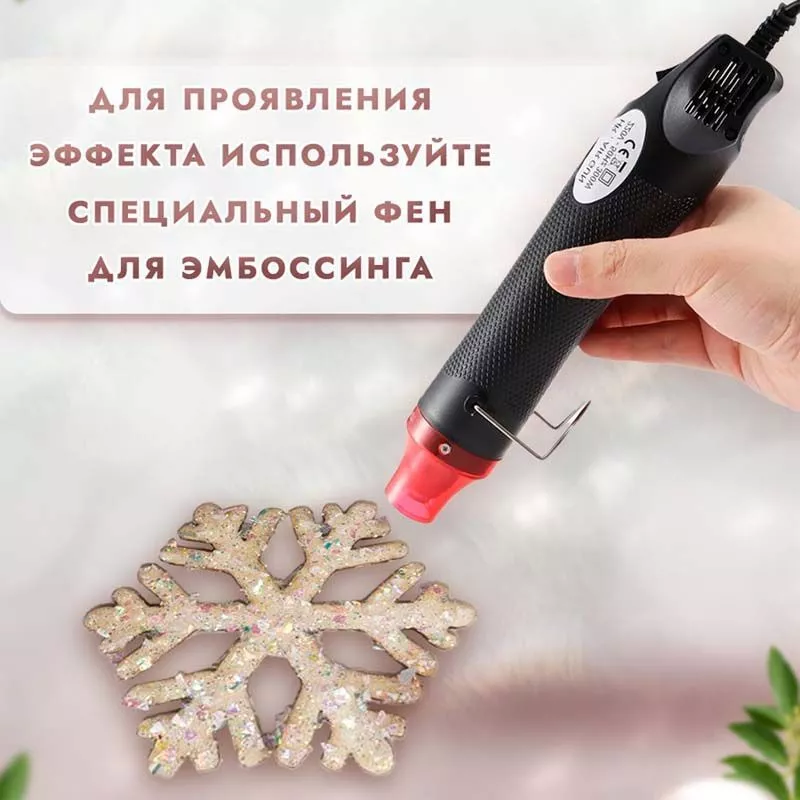 При запекании пудра создает полупрозрачное покрытие с блеском глиттера. Способ применения: нанесите клей для эмбоссинга на штамп или нарисуйте кистью на поверхности задуманный рисунок, затем нанесите пудру для эмбоссинга, пудра останется только там, где был нанесен клей, излишки пудры стряхните обратно в баночку. После этого, нагрейте полученный оттиск феном для горячего эмбоссинга, пока пудра полностью не расплавится. В результате этого процесса вы получите объемное изображение с эффектом эмбоссинга. Объем 10 гр