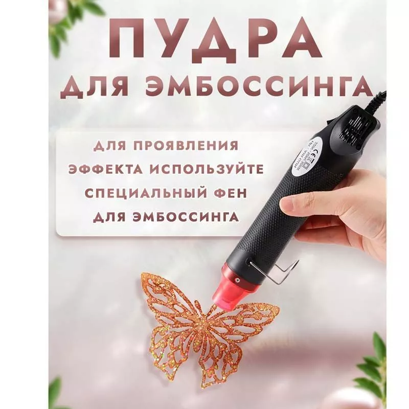 При запекании пудра создает полупрозрачное покрытие с блеском глиттера. Способ применения: нанесите клей для эмбоссинга на штамп или нарисуйте кистью на поверхности задуманный рисунок, затем нанесите пудру для эмбоссинга, пудра останется только там, где был нанесен клей, излишки пудры стряхните обратно в баночку. После этого, нагрейте полученный оттиск феном для горячего эмбоссинга, пока пудра полностью не расплавится. В результате этого процесса вы получите объемное изображение с эффектом эмбоссинга. Объем 10 гр