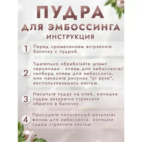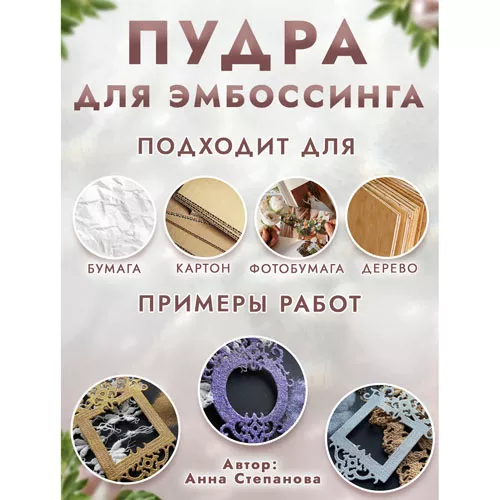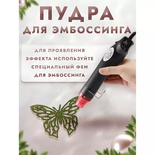 При запекании пудра создает полупрозрачное покрытие с блеском глиттера. Способ применения: нанесите клей для эмбоссинга на штамп или нарисуйте кистью на поверхности задуманный рисунок, затем нанесите пудру для эмбоссинга, пудра останется только там, где был нанесен клей, излишки пудры стряхните обратно в баночку. После этого, нагрейте полученный оттиск феном для горячего эмбоссинга, пока пудра полностью не расплавится.